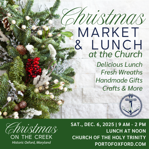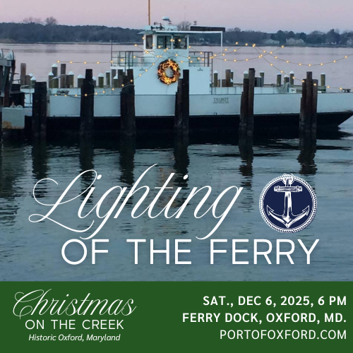This year’s event features a new lighting ceremony on the Oxford-Bellevue Ferry and refreshment stops at Cutts & Case Shipyard and Campbell’s Town Creek Boatyard, along with two weekends of market shopping opportunities and plenty of public spaces to enjoy Oxford’s waterfront views.